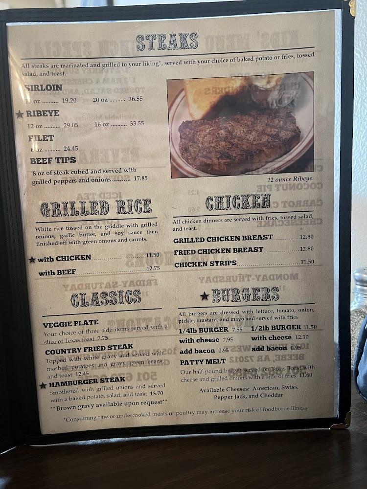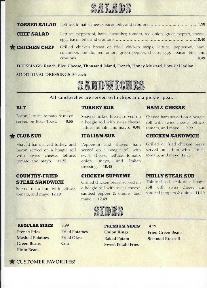Salads, sandwiches, steaks, and fried dishes form the backbone of the meal options. Signature plates include burgers, chicken fried steak, and various sides such as mashed potatoes and pinto beans.
