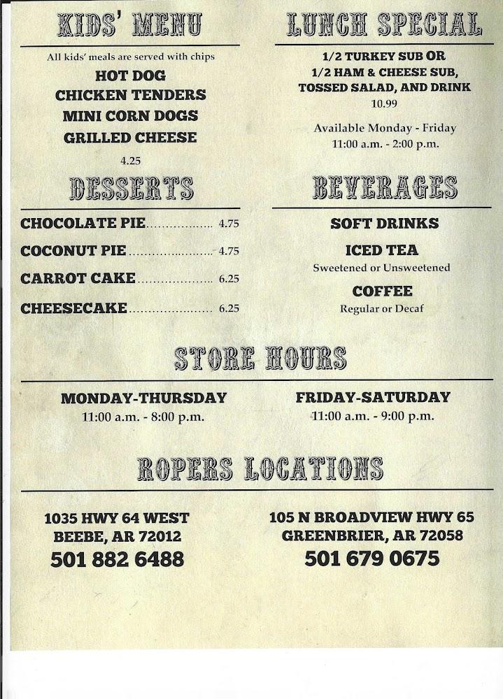 Kids can enjoy a special menu with hot dogs and grilled cheese. Desserts also shine, with chocolate pie and coconut pie as favorites. The average price for the entire menu remains affordable, making Ropers a go-to for casual dining.
